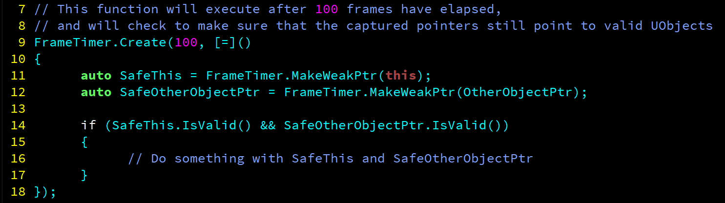 Here’s a tiny header-only C++ library that provides a class for executing lambdas with a frame delay in Unreal Engine. You can get it on Github. It’s experimental, so use at your own risk. ;D